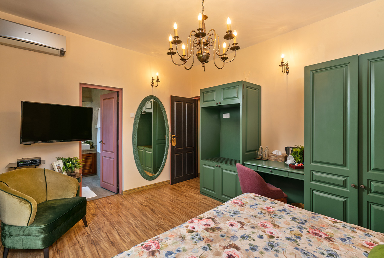 The Evergreen room transports guests into the lavish green oasis designed to refresh and reset the mind and body while allowing guests to reflect on nature rich views through the private balcony.
