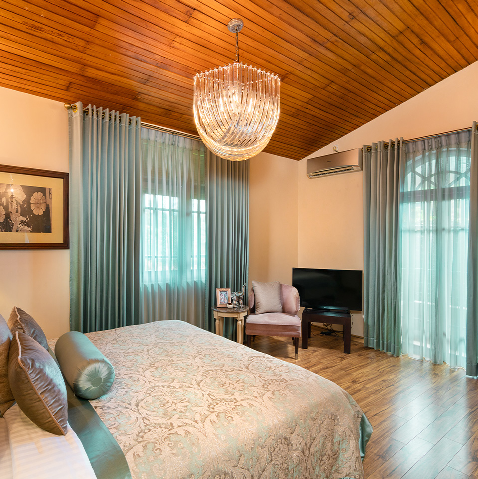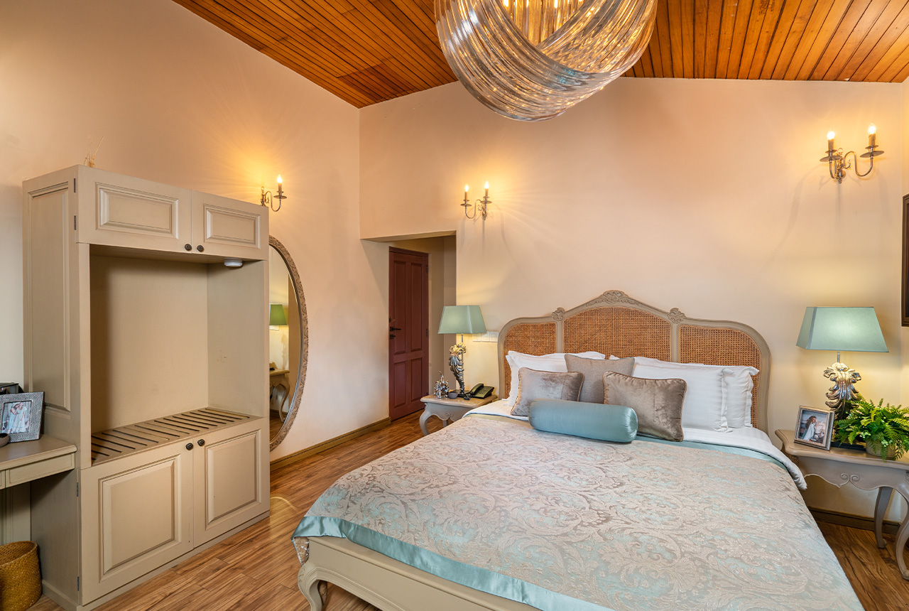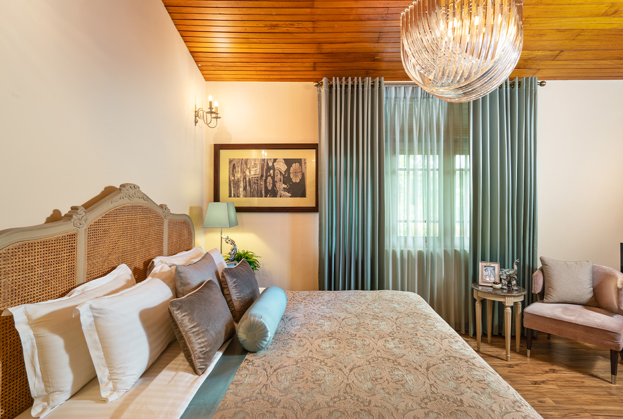 This space transports guests into a luxurious colonial space with furniture units upholstered in powder blue sheer curtains and bolster cushions along with neutral fabrics patterned that are unique, exclusive and tailor-made. The taupe accent chair and wardrobes elevates the space to provide more comfort.