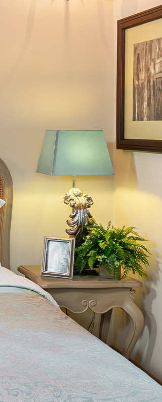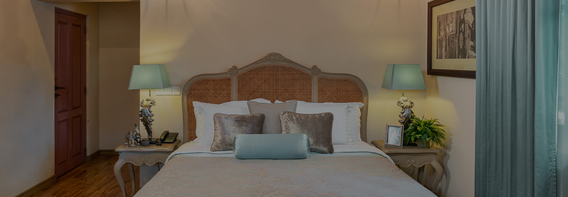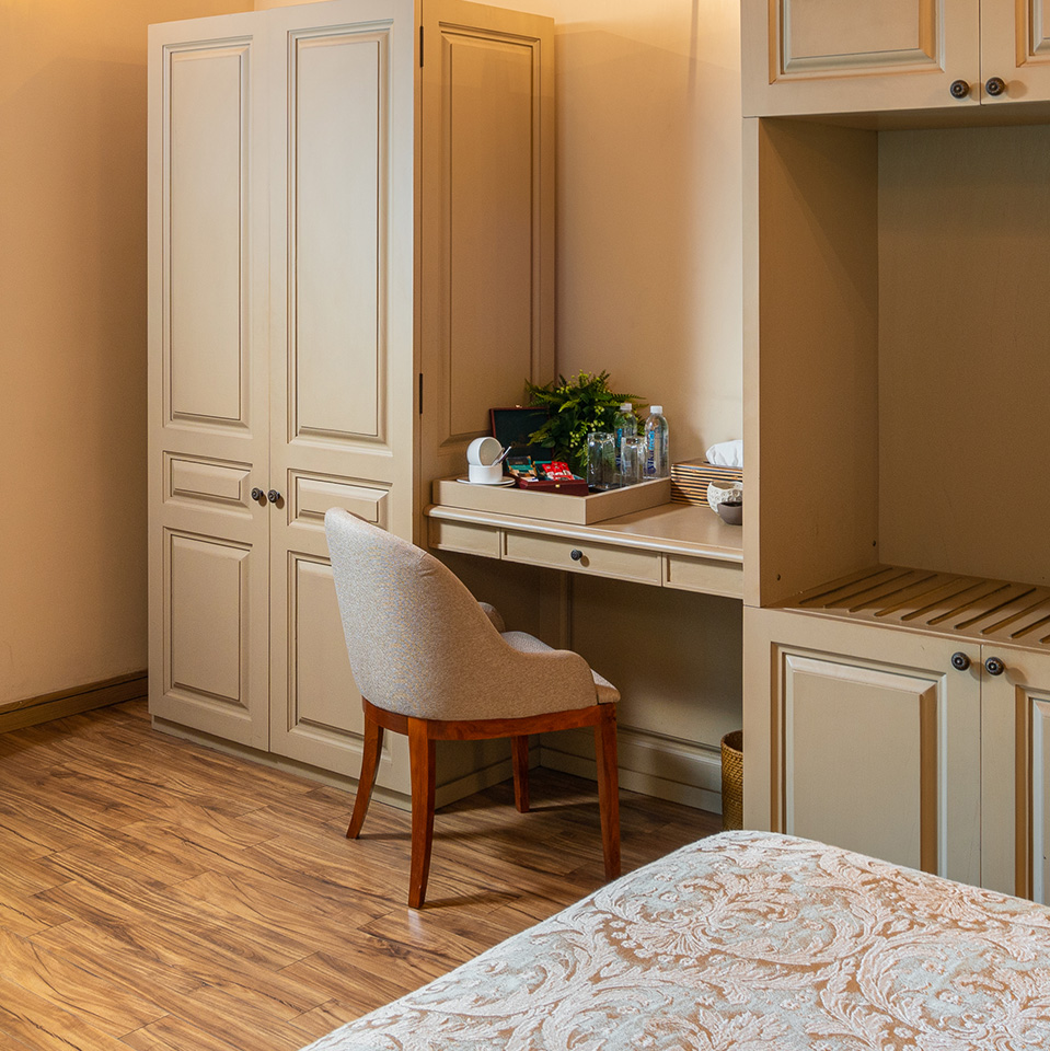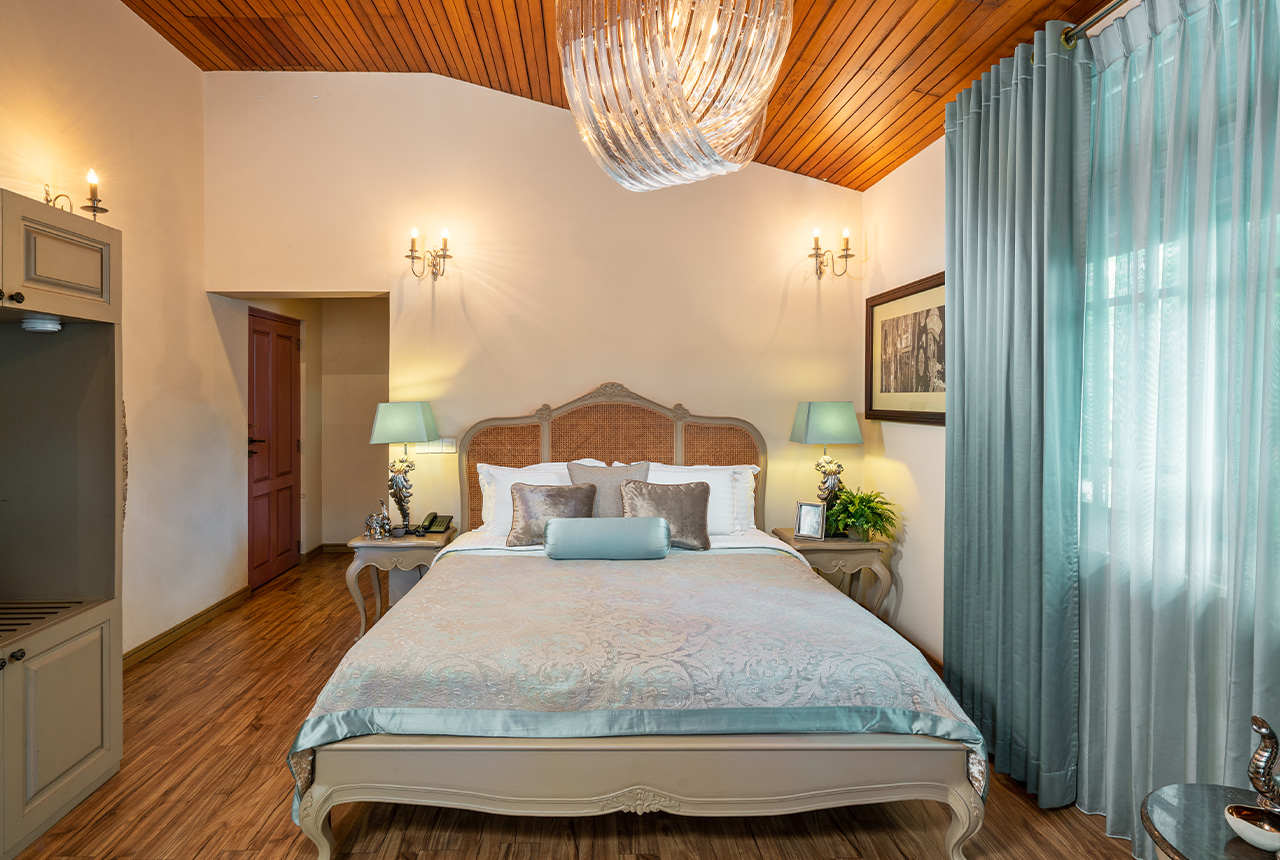 This space transports guests into a luxurious colonial space with furniture units upholstered in powder blue sheer curtains and bolster cushions along with neutral fabrics patterned that are unique, exclusive and tailor-made. The taupe accent chair and wardrobes elevates the space to provide more comfort.