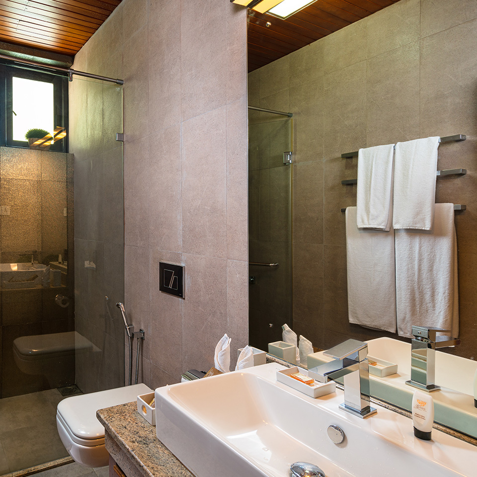 Simplicity and great taste are key design elements in the bathroom, equipped with all comforts and refined Wengè details.