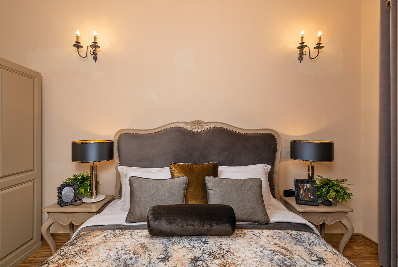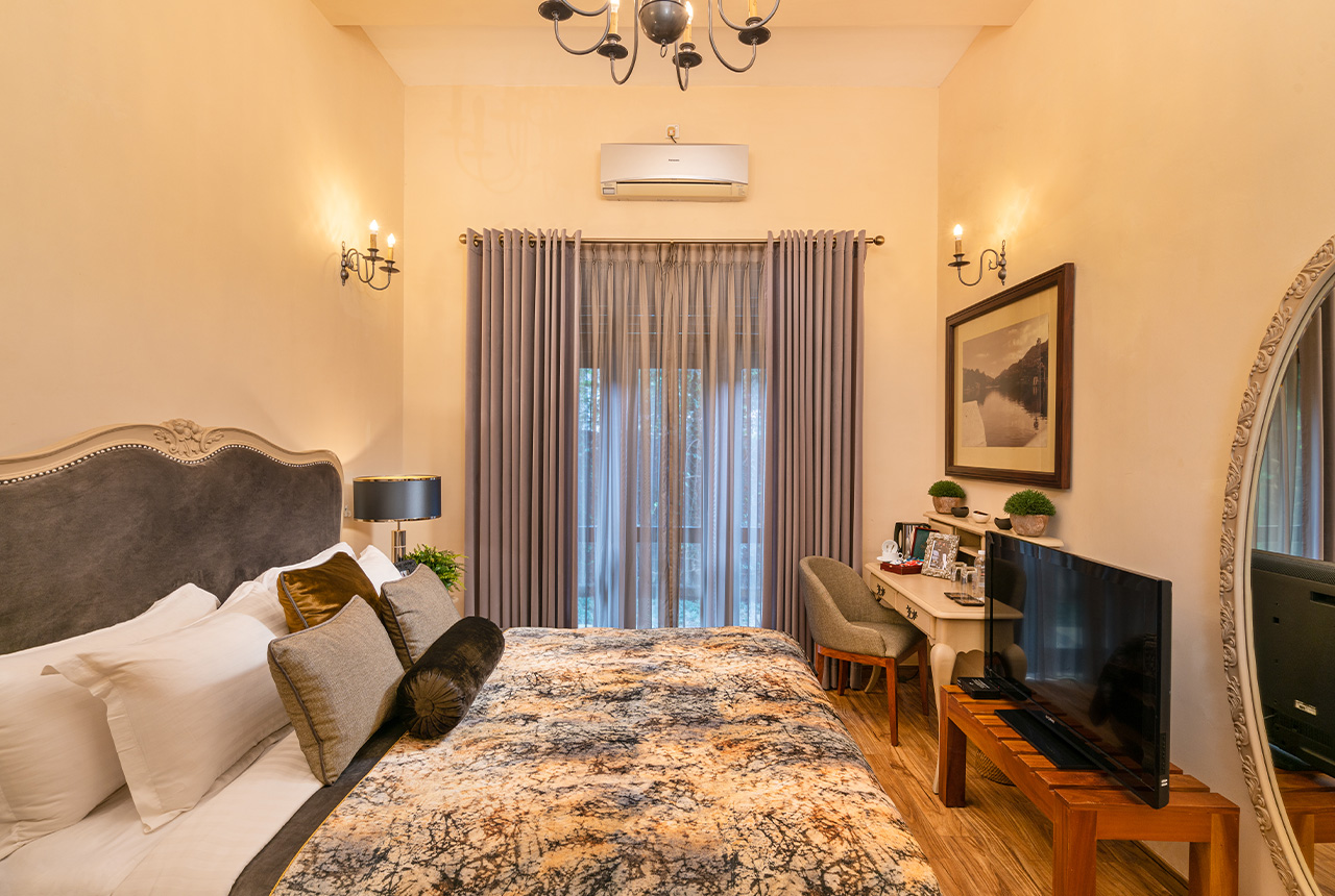 This space transports guests into a luxurious colonial space with furniture units upholstered in aluminum shaded fabrics and bolsters with patterned bed linen to give character and identity to the interior unique, exclusive, and tailor-made. The accent chair and Russian white lacquered dresser elevates the space to provide more comfort.