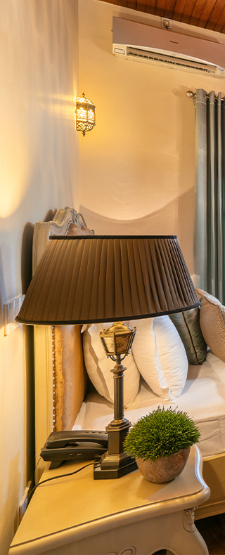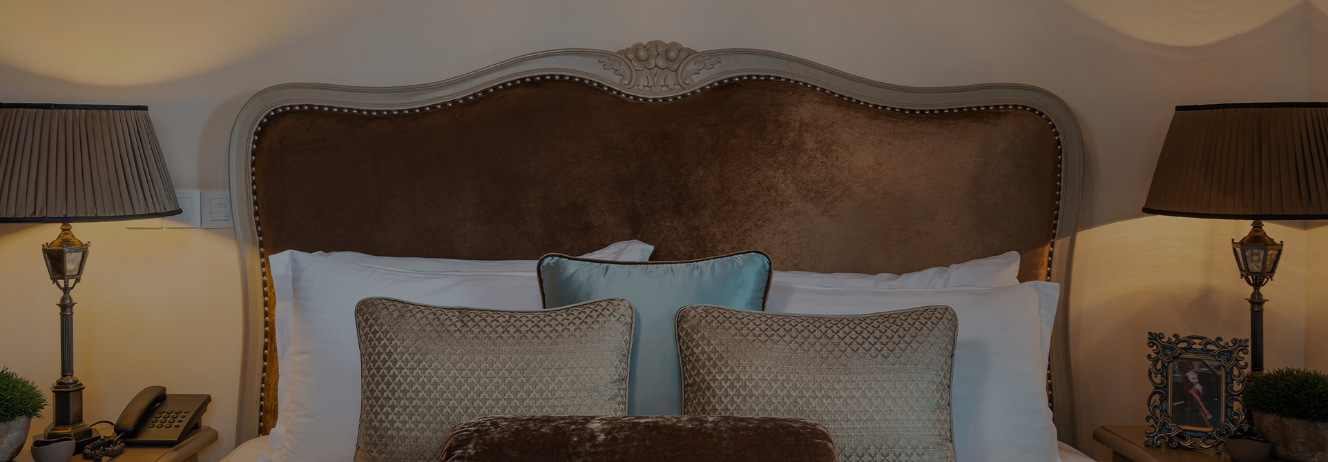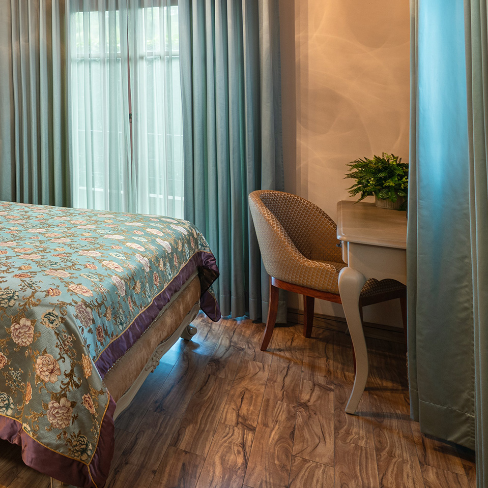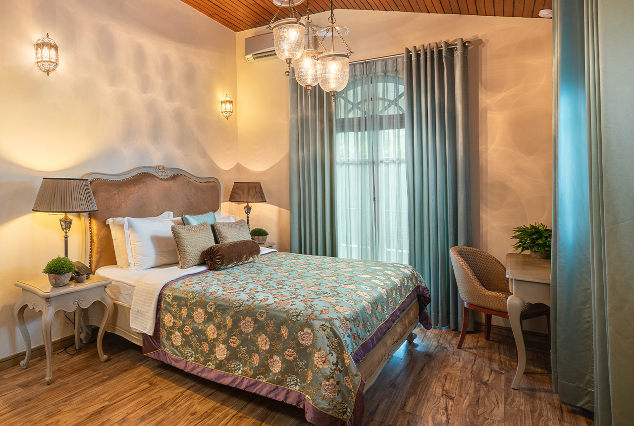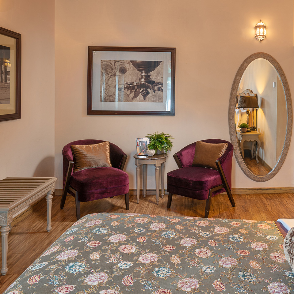 This space transports guests into a luxurious colonial space with furniture units upholstered in rich taupe brown fabrics and burgundy shaded accent chairs that are unique, exclusive, and tailor-made.