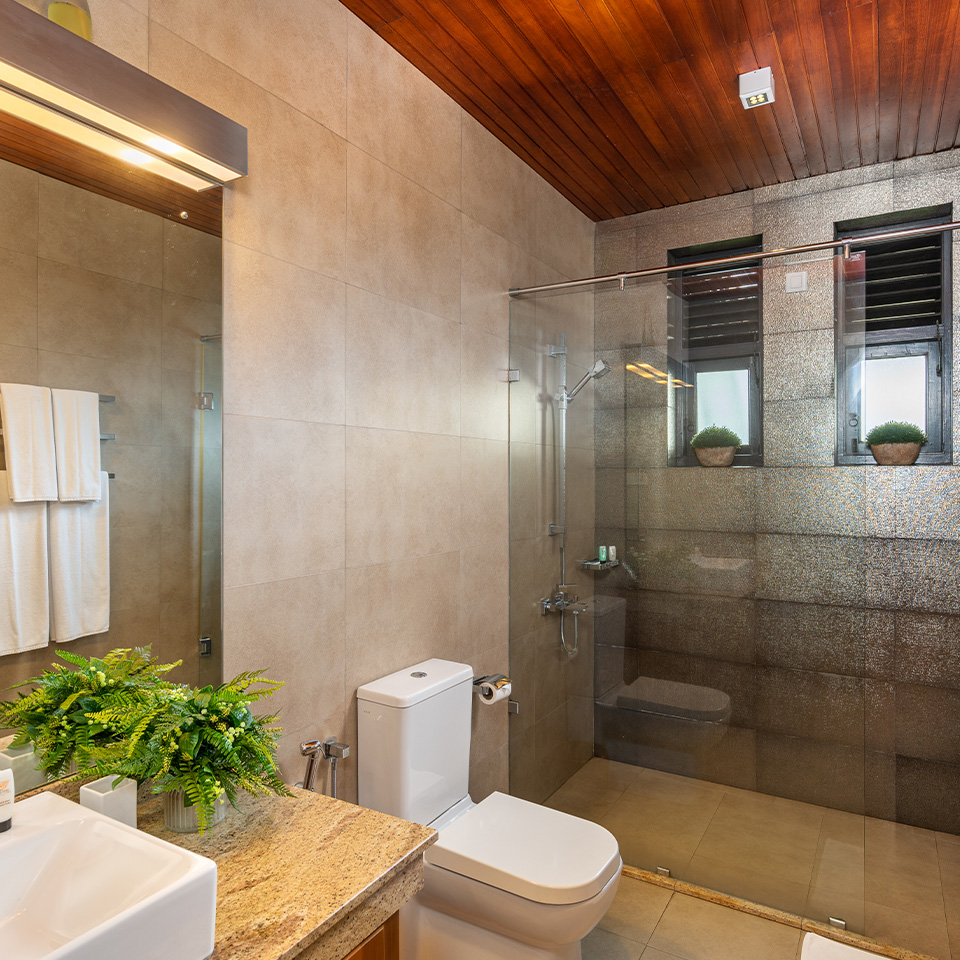 Simplicity and great taste are key design elements in the bathroom, equipped with all comforts and refined Wengè details.
