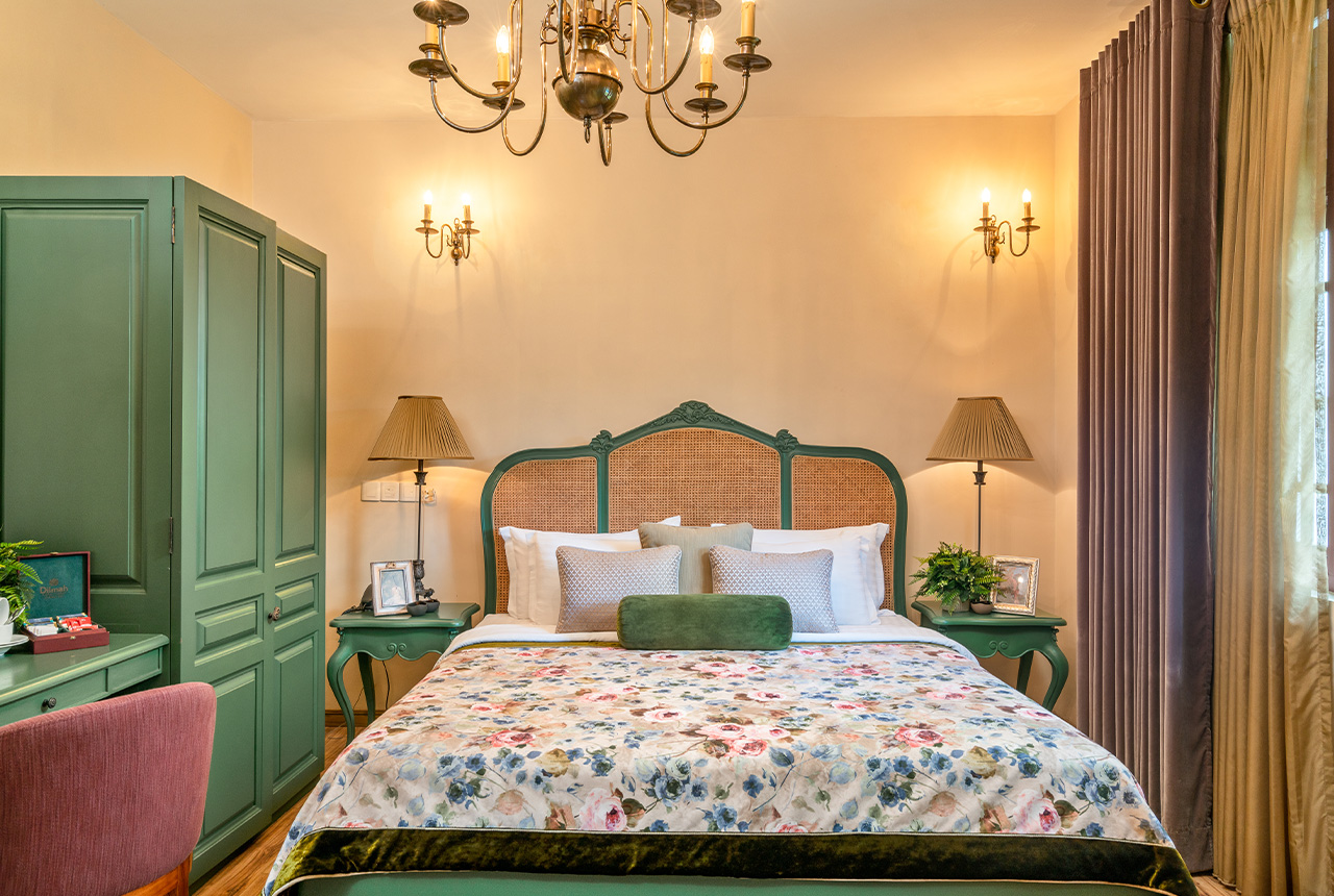 The Evergreen room transports guests into the lavish green oasis designed to refresh and reset the mind and body while allowing guests to reflect on nature rich views through the private balcony.