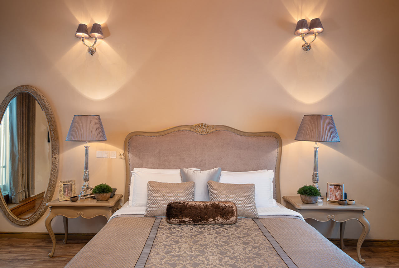 This space transports guests into a luxurious space with furniture units upholstered in rich neutral patterned fabrics that are unique, exclusive and tailor-made. The mauve patterned accent chair and taupe wardrobes elevate the space to provide more comfort.